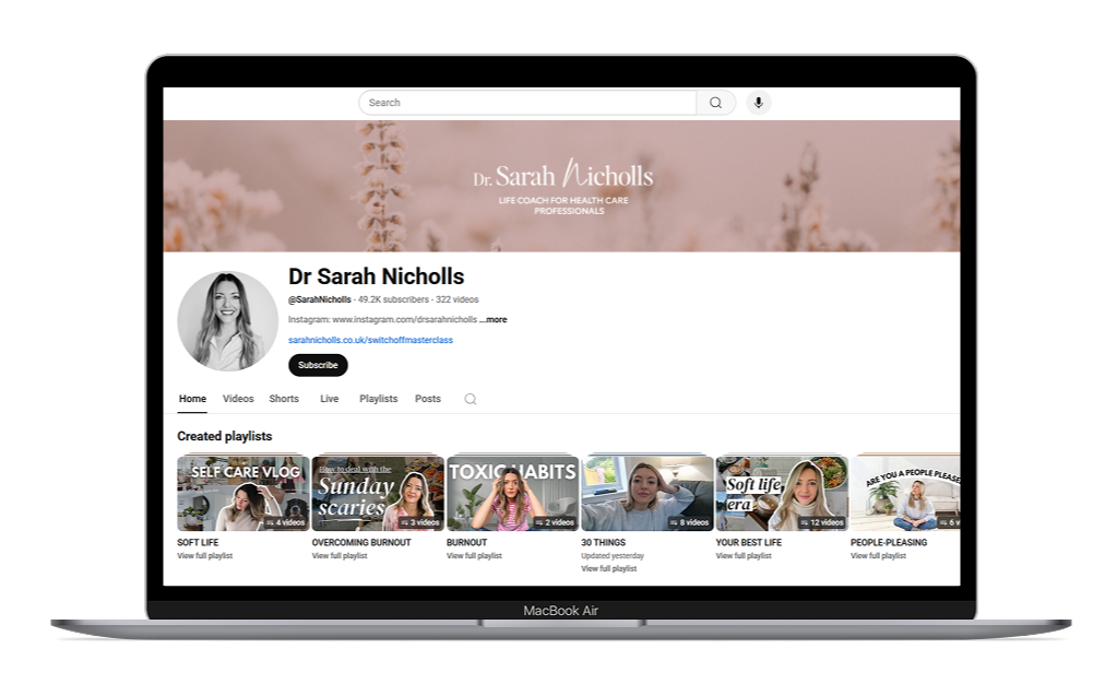 Subscribe to my Youtube channel for a behind-the-scenes look at the latest mindset shifts, boundaries and burnout fixes - straight from a former exhausted doctor who figured out what actually works.